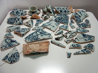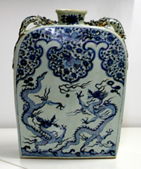 死而复生的元青花双龙四系扁壶者或一对环形系。此类扁壶为元代特有,具有浓郁的异国情调,并非中国传统器物造型。可以想象的是,在成吉思汗的马队向欧洲大陆飞砂走石进发的过程中,随军工匠们从西亚和欧洲的器物中捕捉到了灵感。这种中西文化的交流在中国的家具与建筑中也有不少例证。据马希桂所著《中国青花瓷》一书中所说,传世至今的元青花四系扁壶仅见五件,都在国外。日本出光美术馆收藏的青花双龙四系扁壶和日本松岗美术馆收藏的青花孔雀牡丹纹四系扁壶都是这种器物的代表作。我查阅了文汇出版社出版的《国宝大典》,确实没有看到这种扁壶。但日前我在原上海博物馆文物修复专家、中国文物学会修复委员会的理事蒋道银家中见识了一件元青花四系扁壶,与《中国青花瓷》一书图录中的一件扁壶几乎一模一样,除了肩部各塑有两条螭龙外,体量也几乎一样,通高都在40厘米左右,而且图案也如出一辙:颈部绘有两朵西番莲,螭龙背部弓起,脊梁上有实心圆点装饰。壶身前后的图案,上面三分之一位置以如意云肩纹构勒一个区域,内有双凤穿行在缠枝菊丛中,一上一下,引颈相呼。下面是两条三爪龙蛟龙翻腾于海水之中,双龙中间是一个火球。龙的姿态和眼神都相当生动,威猛灵动,元气十足。壶的侧面也绘有缠枝莲图案。整具器物构图严谨,层次丰富,疏密有致,浑厚茂朴,和谐完美,富丽典雅。元青花扁壶的碎片三个月前,一个收藏界朋友抱着这样一具扁壶来找他,扁壶伤痕累累,表面的裂痕碎成哥窑一般,有些地方还有缺损,留下五六个小洞。蒋道银接受了这个挑战。他先加后将原件拆碎,一一清点,居然有四十多块。然后用药水仔细清洗,再像拼图游戏一样拼装起来。还得内外兼修——先修一部分内部,再修一部分外部,一层层修到口部。用的是强度很高的进口胶水,缺损处一一补上。更难的是用低温仿釉材料将表面做平,还得用画笔将青花图案补齐。大家知道元青花图案粗中有细,笔意恣肆汪洋,予人雄浑大气的美感,这也是元青花的时代特征之一,今人书写的材料与环境都发生了很大变化,要接通七百年的时代气息确实不容易。好在蒋道银是老法师,数十年的修炼,早已得道,他懂得如果向元代的工匠借几笔精神。如此,修了三个多月,他总算松了一口气。我细看之下,糙底,有淡淡的火石红,釉面白中闪青,莹润透亮。修复的那几笔,在细微处体现了水墨画的晕散效果,还有数笔交汇、着墨最浓处那种青中泛紫甚至近黑的铁锈斑,也做出来了。蒋先生让我拍了几张照片,他的表情是相当得意的。他成功地为一件国宝级的文物实施了整形外科手术,忠于原作,又让它焕发了青春。在国内,这样的扁壶即使在博物馆也罕见的,以古陶瓷收藏傲视群雄的上海博物馆也没有。2003年秋,美国收藏家莫瑞尔夫妇将一具体量相当的元青花扁壶拿到美国纽约朵尔拍卖行,最后以583美元的价格成交,创下当时中国青花瓷最高拍卖成交纪录。那具扁壶的纹饰还不如蒋道银修复的那么精美,仅为一龙一凤,而且壶口是重接的,壶身有很长的贯通修复痕迹。据海外报道,这件元青花扁壶系一华人拍得,估计回流到国内了。元青花在中国陶瓷史上有着极其重要的地位,但它却是由西方人发现的,这对中国陶瓷专家是莫大的讽刺。不过也难怪,元青花的存世量极少。照沪上收藏家高阿申的考证,明代政府建立后,将元青花当作意识形态的异端,给予毁灭性的打击。现在西方国家拥有的元青花比国内多,都是当年的外销瓷。十多年前,江西高安省出土一批窖藏元青花,有几件大体量的梅瓶,高安县一下子成了暴发户。有几件小残的梅瓶拿到上海博物馆来修,也是蒋道银修的,我去看过,很幸运地上了手。因为亲睹的机会少,收藏家对元青花的鉴定往往差异很大。前几年山东有一个收藏家一下子拿出几十件元青花办了个展览,还开了研讨会,但许多人看后说是假的。前年,我跟顾行伟等朋友到苏州月亮湾一个古董商人家里淘宝,那个商人家里乱得像个狗窝,陶瓷不少,但真品赝品混作一堆。顾行伟买了两件元青花的匜,手掌那么大,胎骨、花纹、釉色,都体现元青花的特征,总价三万元购下,算是熟客的价。顾让出一件给同行的一位朋友。到了上海,不少朋友去看,都说不出毛病,但也不敢一语断定是真品。三万元买两件元青花,不是天上掉馅饼的事,而是掉一头牛了。后来我在市场上也看到类似的元青花匜现身,但瞄上一眼就知道是不对的。在城隍庙藏宝楼里,偶尔也可以看到元青花瓷器的碎片,小小一片,开价一两千元。也有赝品的碎片出现,一不小心就会上当。垃圾也赚钱,就是我们所处时代的特征的。