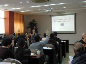 第二阶段会议,由五届理事会副理事长承焕生主持。会议首先由张申秘书长介绍本届理事会换届改选工作情况;工作人员宣读了理事会换届改选办法、新一届理事候选人简况等资料。接着,会议以举手表决方式,通过了大会总监票人和监票人,并进行了研究会第六届理事会理事和监事的选举。经现场统计,第六届理事会11位理事和监事候选人,都超过了三分之二以上选票,全部当选为研究会第六届理事会理事。
