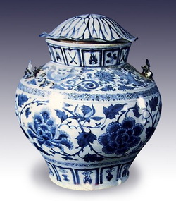 泰国大城博物馆收藏的元青花缠枝牡丹杂宝兽耳大罐,其器型端庄厚重。与安徽省蚌埠博物馆所藏,出土于明代大臣汤和墓的元青花缠枝牡丹杂宝兽耳大罐是孪生姊妹罐。无论是器形大小、纹饰绘画、青花发色都很相似,只是泰国大城博物馆的大罐无盖而已。此罐通高约47厘米,小口、直唇、高颈、斜宽肩、鼓腹,矮圈足。肩腹无明显界限,肩置对称双兽面耳。整个器物造型端严古朴,通体以青花绘有主体纹饰七层:盖沿饰钱纹一周;颈为波涛纹;上肩绘莲瓣纹一周,莲瓣内填绘有道家杂宝法器;下肩绘缠枝莲纹,间贴塑两个兽面耳;腹部主体绘缠枝四季花卉;腹下绘忍冬纹一周;最下绘仰莲瓣纹一周。这件青花缠枝纹大罐纹饰富丽精工,青花发色蓝中闪现宝气,铁锈斑凝结下沉,有大小坑点,蓝色亮丽而又沉稳,是典型的“宝兰”苏麻离青料呈色。画工老道而流畅,达到了元代青花瓷器的最高艺术水准。(来源:《文物鉴定与鉴赏》杂志)